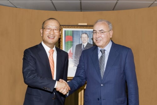 사진설명=지난 4일 오후(현지시간) 알제리 소나트랙 본사에서 삼성엔지니어링 정연주 사장(왼쪽)이 소나트랙 모하메드 메지니 회장(Mr.Mohamed MEZIANE)과 계약식을 마치고 악수를 나누고 있다.