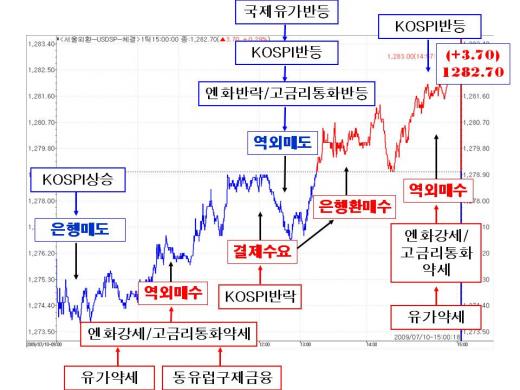 장 초반 KOSPI지수가 상승세를 보임에 따라 달러의 매도포지션을 취했던 은행권이 역외매수와 결제수요에 의해 포지션을 환매수로 바꾸면서 환율이 마침내 1280원대에 안착하는 데 일조했다.