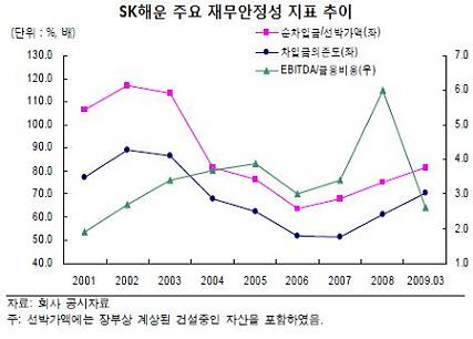 신평사 관계자는 "SK해운은 기존 선박 관련 차입금의 대부분이 원가보상 방식의 장기운송계약으로 체결돼 있어 다른 해운사와 달리 차입금 상환 부담이 큰 편은 아니다"며 "그러나 차입금이 급격히 늘고 있어 업황악화가 지속될 경우, 자금 부담이 커질 가능성은 열려있다"고 말했다.
