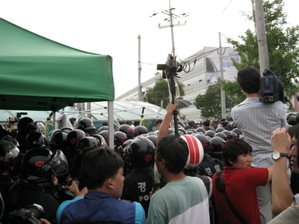 사측도 용역 경비요원 50여 명을 배치해 이를 막아섰고 진보단체 회원들이 생수병을 던지자 용역 경비요원들도 주먹과 발 등으로 응수하면서 맞대응했다.