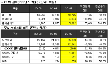 KT는 이날 2분기동안 매출 3조5643억원, 영업이익 3635억원, 당기순이익 4561억원을 기록했다고 발표했다. 4, 5월 실적은 합병전 KT 실적을 토대로 한 것이고, 6월은 KTF 합병에 따라 통합KT이 실적을 기반한 것이다.