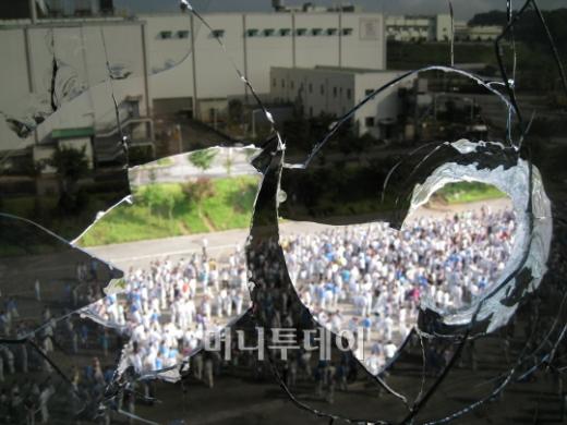 13일 오전쌍용차(3,440원 ▼10 -0.29%)평택공장이 84일 만에 전면 정상가동에 돌입하면서 3000여명의 직원들이 첫 조회를 위해 본관 뒤편 광장에 모여 있다. 본관 유리창은 파업 기간 동안 노조와 충돌로 대부분 파손됐다.