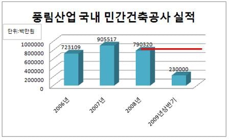 민간공사 수주도 어렵다. 올 상반기 풍림산업의 국내 민간건축공사 수주실적은 2300억원. 시공실적의 대부분을 차지하는 민간건축공사의 경우 지난해 7900억원에 달한 점을 감안하면 턱없이 부족한 실적이다.