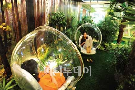 개관한지 1주일이 지난 이날, 아직 많지는 않지만 곳곳에 직원들이 피로를 푸는 모습이 보인다. 동료로 보이는 남자 직원 둘은 동작으로 인식하는 야구게임에 열중이고, 다른 한 편에는 임원인 듯한 남자가 골프게임에 빠져 있다. 사랑방에는 여직원 둘이 수다를 떨고, 알 모양의 소파에서는 한 남자가 잠시 눈을 붙이고 있다.
