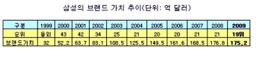 글로벌 금융 위기의 영향으로 삼성의 브랜드가치는 지난 해 176억9000만 달러에 비해 1% 감소했으나 100대 브랜드 기업들의 평균 하락률보다는 높았다.