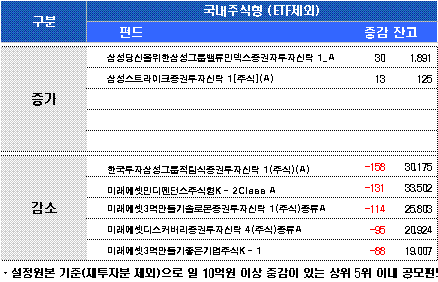 '한국투자 삼성그룹적립식증권투자신탁1주식A'(-158억원), '미래에셋 인디펜던스주식형K-2클래스A'(-131억원), '미래에셋 3억만들기솔로몬증권투자신탁1주식종류A'(-114억원), '미래에셋 디스커버리증권투자신탁4주식종류A'(-95억원) 등 수탁액이 큰 펀드의 환매가 컸다. 자금 이탈의 원인이 차익실현이었기 때문이다.