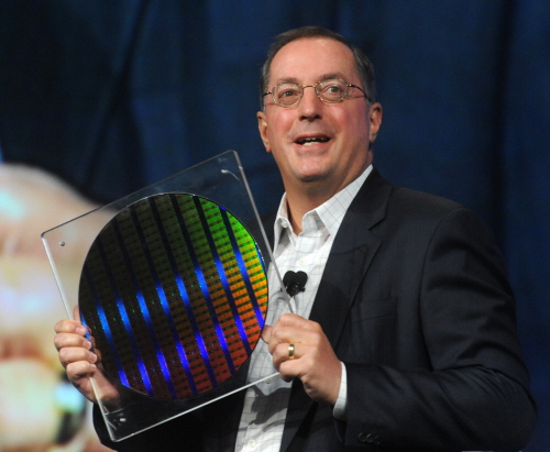 폴 오텔리니 인텔 사장 겸 CEO가 22일(현지시간) 세계 최초로 22나노(nm) 공정 기술 기반의 워킹 칩(동작 칩)과 실리콘 웨이퍼를 선보였다.