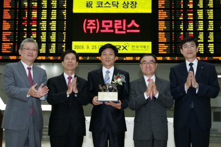한국거래소 코스닥시장본부(본부장 박상조)는 25일 서울사옥 종합홍보관에서 휴대폰용 터치스크린 패널을 생산하는모린스의 코스닥시장 신규상장기념식을 개최했다. 왼쪽부터 정영채 우리투자증권 IB본부장, 박상조 한국거래소 코스닥시장본부장, 석송곤 모린스 대표이사, 김재찬 코스닥협회 부회장, 정성수 현대증권 부사장. 독자들의 PICK! "모텔 여사장과 잤다" 아내가 불륜 중독...돈 받는 연하남=친아들 동생에 '극약' 먹이고 학대한 언니…수십 년 뒤 연락해 "신장이식 좀" "아내 실종, 강간당했다"...손님 유혹해 성관계, 부부의 자작극 정선희 '집 경매' 위기에 하루 3.5억 모아준 동료들…"빚 갚으려 살았다"