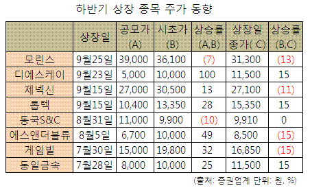 하반기 들어 시초가가 공모가보다 낮게 형성된 것은 지난달 31일 상장한 동국S&C 이후 두 번째이며, 시초가와 종가 모두 하락한 것은 모린스가 처음이다.