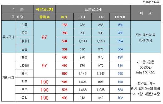 요금제는 기본적으로 이용시마다 요금이 부과도는 '표준요금제'와 가입 후 할인 가격으로 이용할 수 있는 '세븐요금제'로 나뉘어 서비스한다. 가입형 할인요금제인 세븐요금제는 월 1000원 기본료에 분당 97원(미국, 중국, 캐나다)의 요금으로 이용할 수 있다.