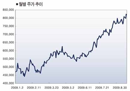 하지만 7월 66만3870원으로 오른 삼성전자 주가는 8월 73만6190원, 9월25일 현재 79만5000원의 월평균주가를 기록했다.