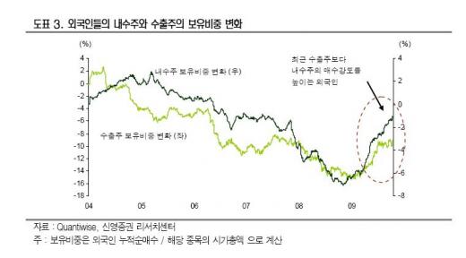 신영증권은 외국인들이 최근 내수주에 주목하고 있지만, 수출주에 대한 급작스런 매도도 어려울 것으로 내다봤다.
