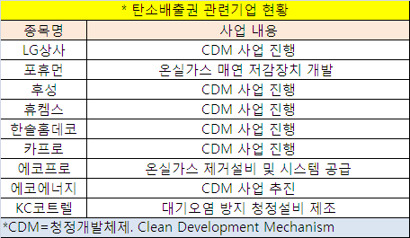이날 탄소배출권 관련주의 동반 급등은 지난 2월 정부가 제출한 '저탄소 녹색성장 기본법'이 국회 기후변화대책특위 법안심사소위원회를 통과했다는 소식 때문이었다. 이 법안엔 온실가스 배출을 최소화하기 위한 탄소배출권 거래제 도입이 주요 내용으로 담겨 있다.