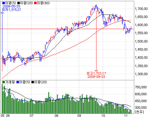 김 팀장은 최근 거래량 감소의 의미는 과거 경험상 중기 조정 국면이 마무리 단계에 들어서 있을 확률이 높다는 점을 강조했다. 앞선 10월에 1700선에서 1500선까지 단기 조정을 겪은 증시가 매도 세력의 후퇴가 가시화되면서 단기적인 저점 부근에서 체력 회복의 시기를 기다리고 있다는 점에 중점을 둔 셈이다.