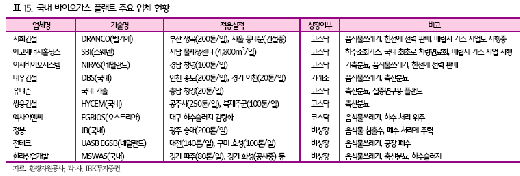 이어 바이오가스 플랜트 관련업체로는 도심 음식물쓰레기 처리시설 BTO(수익형민자사업)에 특화를 보이고 있는서희건설(1,623원 0%)과 매립지 가스발전 경험을 통해 바이오가스의 차량연료화를 추진 중인에코에너지(3,075원 ▼125 -3.91%)홀딩스, 가축분뇨 처리로 전력을 판매하고 있는 이지바이오시스템 등을 꼽았다.