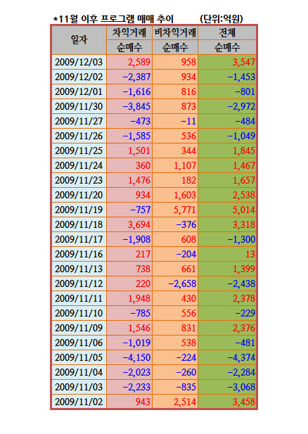 프로그램 매매는 3일 3547억원의 매수 우위를 기록하며 코스피지수의 4거래일 연속 상승과 1610선 지지의 원동력으로 작용했다. 6거래일 만에 순매수로 전환된 프로그램 매매는 차익거래와 비차익거래 모두 순매수를 보이며 '화끈한 복귀'를 신고했다.