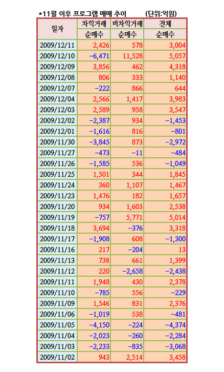 12월 동시 만기일인 전날 장마감 동시호가에서 8000억원 넘는 프로그램 순매수가 몰린 것을 비롯해 5057억원의 매수 우위 이후 이날 또다시 매수세가 가동되며 코스피지수의 3거래일 연속 오름세를 주도했다.