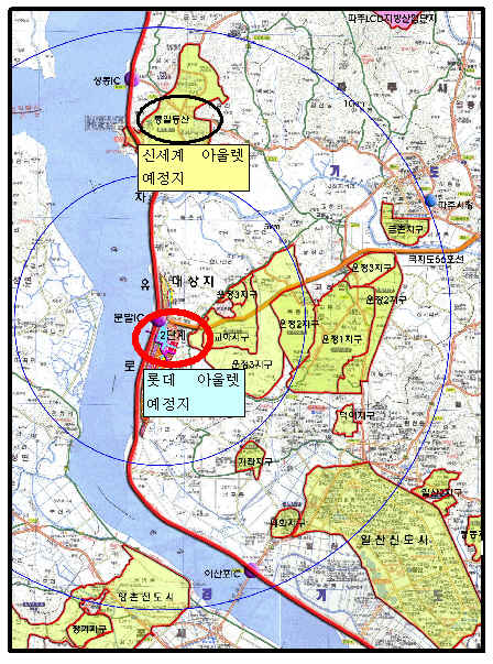 롯데백화점이 매입한 부지 규모는 통일동산 신세계 첼시 아울렛(8만6172㎡, 2만6067평)의 절반이 채 안 된다. 그러나 입지여건은 통일동산보다 유리하다는 게 업계의 분석이다. 자유로 문발IC에서 1Km 거리로 통일동산보다 서울에서 자동차로 15분 정도 가깝다. 교하지구는 물론 파주신도시와도 자동차로 10분 이내 거리다. 일산 신도시에서의 접근성도 통일동산보다 10여 분 더 빠르다.