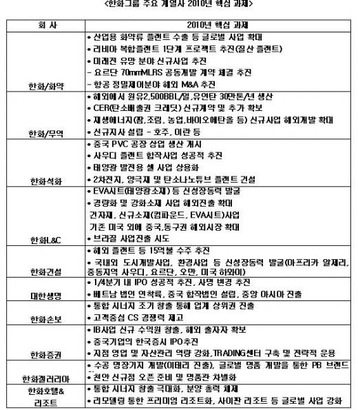 한화(123,500원 ▼9,100 -6.86%)는 18일 서울 중구 장교동 한화빌딩 28층 대회의실에서 김승연 회장을 비롯한 계열사 대표이사, 경영기획실 임원 등 50여 명이 참석한 가운데 열린 '2010년 경영전략회의'에서 이 같이 확정했다고 밝혔다.