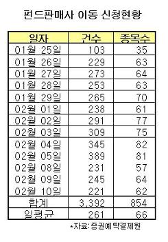 ◇고객은 심드렁=11일 증권업계와 증권예탁결제원에 따르면 지난 10일까지 펀드 판매사 이동 건수는 모두 3392건에 불과하다. 지난달 25일 시작된 이후 영업일수로 13일이 지났지만 하루 평균 261건에 그치고 있는 셈이다.