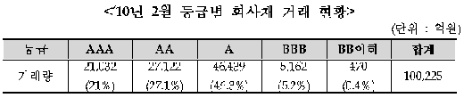 회사채시장의 경우 우량등급 위주로 매수세가 증가했다. 신용등급 'A-' 이상 회사채 거래 비중은 94.4%로 압도적이었고 비우량 회사채인 'BBB+'급 이하 거래는 5.6%에 그치는 부진을 보였다.