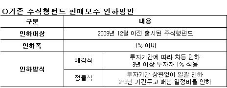 감독당국은 기존 주식형펀드의 판매보수도 신규 펀드와 동일하게 1% 이내로 내린다는 방침을 전달했다. 앞서 금융위는 지난해 12월 자본시장법시행령을 개정, 신규 펀드의 판매보수 상한선을 5%에서 1% 이내로, 판매수수료는 5%에서 2% 이내로 각각 내린 바 있다.