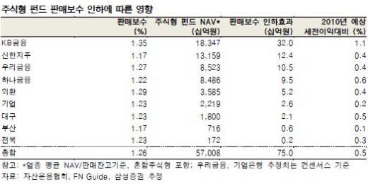 그는 또 "750억원 이익 감소는 올해 예상 세전이익의 0.5%에 해당하는 미미한 수준"이라며 "따라서 기존 주식형펀드 판매보수 인하에 따른 은행의 영향은 제한적일 전망"이라고 말했다.