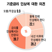 이는 머니투데이가 지난 4월30일부터 5월10일까지 홈페이지에서 실시한 온라인 투표에서 내년 이후에 금리를 올려야 한다는 의견이 31%였던 반면, 올해 중에 올려야 한다는 의견이 69%였던 것과 대조적이다. 2분기중 인상 의견은 41%, 3분기(17%)와 4분기(11%) 중 인상론도 적지 않았다.