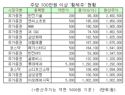 액면가를 동일 기준으로 환산해서 환산주가 기준으로 따져보면 국내 증시에 100만원을 넘어서는 황제주는 더 많다. 15일 종가기준으로 코스피 11개, 코스닥 2개 등 총 13종목이다.