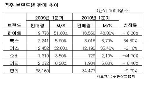 한국주류산업협회에 따르면 맥스의 올해 1분기 출고량은 301만6000상자로 전년보다 34.6% 늘었다. 국내 맥주시장 1분기 성장률이 전년대비 9.7% 줄어든 것을 감안하면 맥스 성장세는 폭발적이다. 맥스는 맥주시장 침체에도 불구, 매년 50% 정도 판매량이 늘며 국내 맥주 중 판매 성장률 1위를 달리고 있다.