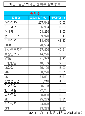 유통대표주인신세계(330,000원 ▲19,000 +6.11%)(982억원)를 3번째로 많이 산 것을 비롯해 한국전력(887억원), NHN(387억원), KT&G(417억원) 등 내수주도 외국인 매수 상위종목에 올랐다. 대한항공도 401억원 사들였다.