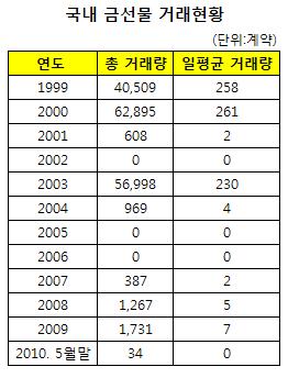 반면, 뉴욕 상업거래소에 상장된 금선물의 경우 지난해 말 기준으로 3500만 계약을 기록했으며, 동경 상품거래소의 금선물 역시 1200만계약에 달했다.