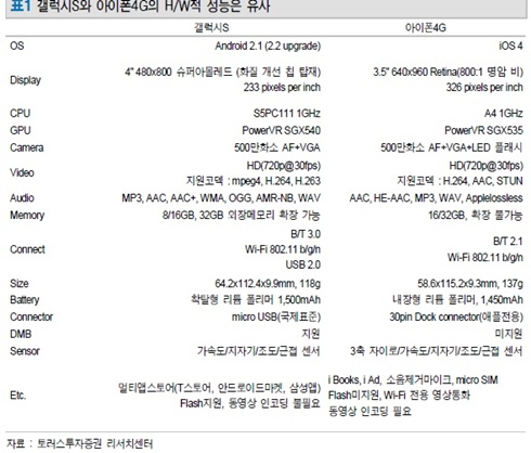 토러스투자증권은 21일 업종보고서를 통해서 삼성전자의 안드로이드 스마트폰 갤럭스S와 애플 아이폰4를 비교분석한 결과 "두 기종 모두 전작의 단점을 보완해 하드웨어적 성능의 차이는 미미하다"고 평가했다.