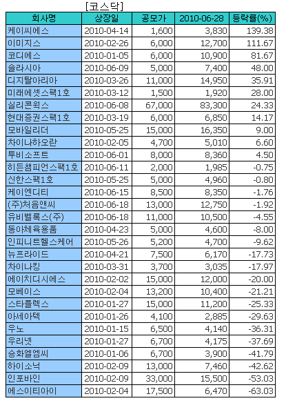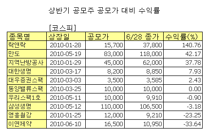코스피종목 중에는락앤락의 공모가 대비 수익률이 140.76%로 가장 높았다. 공모가 1만5700원으로 지난 1월28일 상장한 락앤락의 현재 주가(28일 종가)는 3만7800원이다.