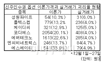 금감원도 이같은 시장의 상식에 착안해 옵션 이론가격을 적시하도록 규정했다. 그러나 이론 가격 그대로 거래되는 사례는 찾기 힘든 실정이다.