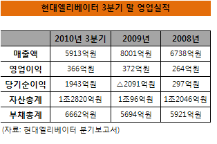 영업실적도 상당폭 개선됐다. 현대엘리베이터의 올 3분기 까지 매출액은 5913억7000만원, 영업이익은 366억원을 기록했다. 지분법 평가이익 및 파생상품 이익등으로 당기순이익은 1934억원에 달한다. 영업이익률은 6.1%, 당기순이익률은 32.7%에 달한다.