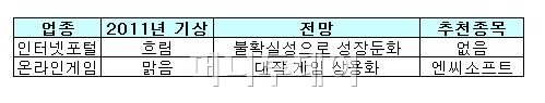 지난해 인터넷포털은 월드컵 등 스포츠 이벤트 영향으로 '맑음'이었다. 하지만 올해는 실물경기 둔화 및NHN(216,500원 ▼2,000 -0.92%)과 오버추어의 제휴 종료에 따른 불확실성으로 성장세가 약화될 것이란 전망이다.