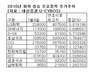 2010년 화학·정유주는 화려했다. 코스피 화학업종 지수는 지난해 1월4일 3009.67에서 그 해 말 4683.37까지 56% 상승했다.