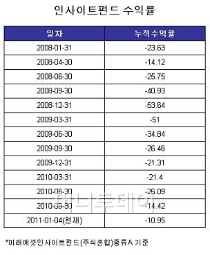 단기간에 수조원의 자금을 모으며 화려하게 출발한 인사이트펀드는 한때 -50%가 넘는 수익률을 기록, 투자자들의 원성을 들었다. 막대한 중국투자 비중이 한몫 했다. 미래에셋 인사이트펀드가 중국 편입비중을 늘렸던 2008년 1월부터 2009년 5월사이 주요 투자처였던 H지수(중국 본토 주요기업 구성)와 홍콩 항셍지수는 약세를 보였고, 펀드 수익률 역시 동반 하락세를 나타냈다.