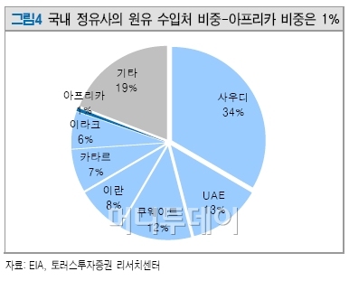 반면 국내 정유사는 아프리카 원유 도입 비중이 1%에 불과하다. 북아프리카 사태가 중동까지 번지지 않을 경우 원유공급 리스크는 제한적이다.
