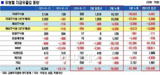 해외 주식형펀드에서는 이날도 294억원이 빠져나가 37거래일 연속 자금이탈을 기록했다. '삼성CHINA2.0본토증권자투자신탁 1[주식](A)' 57억원, '슈로더브릭스증권자투자신탁A- 1(주식)' 52억원이 각각 빠져나갔다.