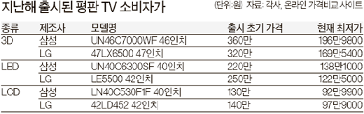 현재 온라인쇼핑몰에서는 지난해 나온 40인치대 초반 크기의 LED TV를 120만~140만원에 살 수 있다. 지난해 처음 출시할 때 220만~250만원 하던 게 거의 반 토막 났다. 비슷한 크기의 LCD TV의 경우 지난해 모델은 현재 90만원대다.