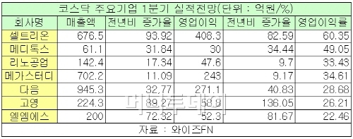 코스닥 시총 1위셀트리온(202,000원 ▲8,300 +4.28%)의 1분기 영업이익률이 60%를 넘어설 것으로 전망된다. 상위 코스닥 기업들도 대부분 순항을 이어갔다.