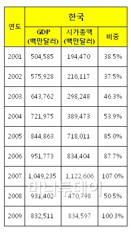 한국에서 GDP 대비 시가총액 비중은 2001년 38.5%에서 2006년 87.7%로 두 배 이상 증가했고 다시 5년이 지난 지금은 100%를 웃도는 등 매년 높아지는 추세다. 반면 외국의 경우 한국처럼 GDP 대비 시가총액 비율이 꾸준히 늘어나는 모습은 보이지 않는다.