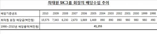 실제로 최 회장이 1997년 외환위기 이후 13년간(1998~2010년) SK그룹 지주회사인 SK C&C로부터 받은 배당금은 412억5500만원에 달했다.