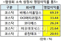 영업이익률에서는 세계 1위의 모바일용 마이크로폰 제조업체비에스이(4,640원 ▼100 -2.11%)를 자회사로 두고 있는 지주사 비에스이홀딩스가 매출감소 등에도 불구, 68.19%에 달하는 영업이익률로 1위를 차지했다.