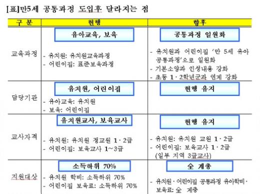 정부는 올 하반기 중 유아교육법시행령, 영유아보육법시행령 등 관련 법령을 개정한 후 내년 3월부터 '만5세 공통과정'을 전면 시행할 예정이다.