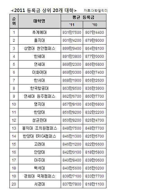 9일 '대학알리미(www.academyinfo.go.kr)' 사이트에 공시된 정보에 따르면 전국 4년제 일반대학 191개교 중 2011학년도 평균 등록금이 800만원을 넘는 대학은 총 50곳으로 이 중에서도 서울시내 주요 사립대학들은 모두 상위에 랭크됐다.