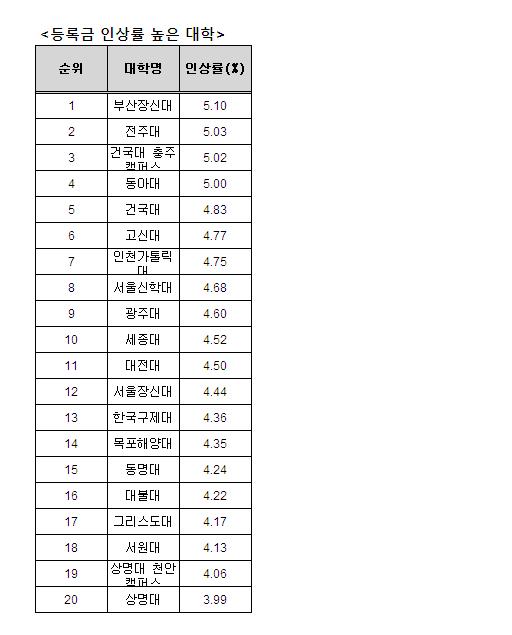 전년대비 등록금 인상률이 가장 높은 대학은 부산장신대(5.10%)였고, 전주대(5.03%), 건국대 충주캠퍼스(5.02%), 동아대(5.00%) 등도 5% 이상의 인상률을 기록했다. 건국대, 광주대, 세종대, 상명대 등도 4%대의 인상률을 나타내며 상위에 랭크됐다.