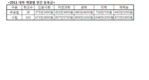 계열별로는 국공립, 사립 모두 인문사회계열(각 375만2000원, 673만2000원)이 가장 낮고, 의학계열(각 718만원, 1048만2000원)이 가장 높은 것으로 나타났다. 자연과학계열(452만3000원, 807만6000원), 공학계열(480만5000원, 869만2000원), 예체능계열(492만5000원, 872만2000원)은 그 사이에 분포했다.